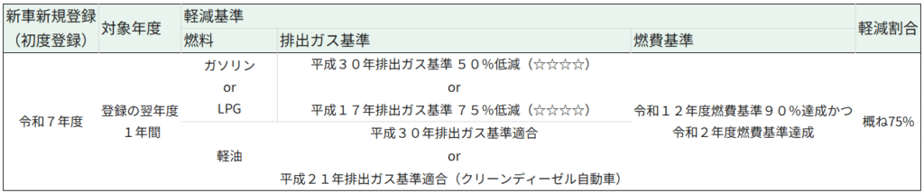 なぜなら、エコカー減税が入ると非常に複雑になるため、新車購入時の1回だけだから安くなってよかったと思う程度でいいかと思います。ただ、参考までにエコカー減税の表は貼っておきます。